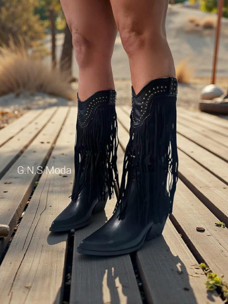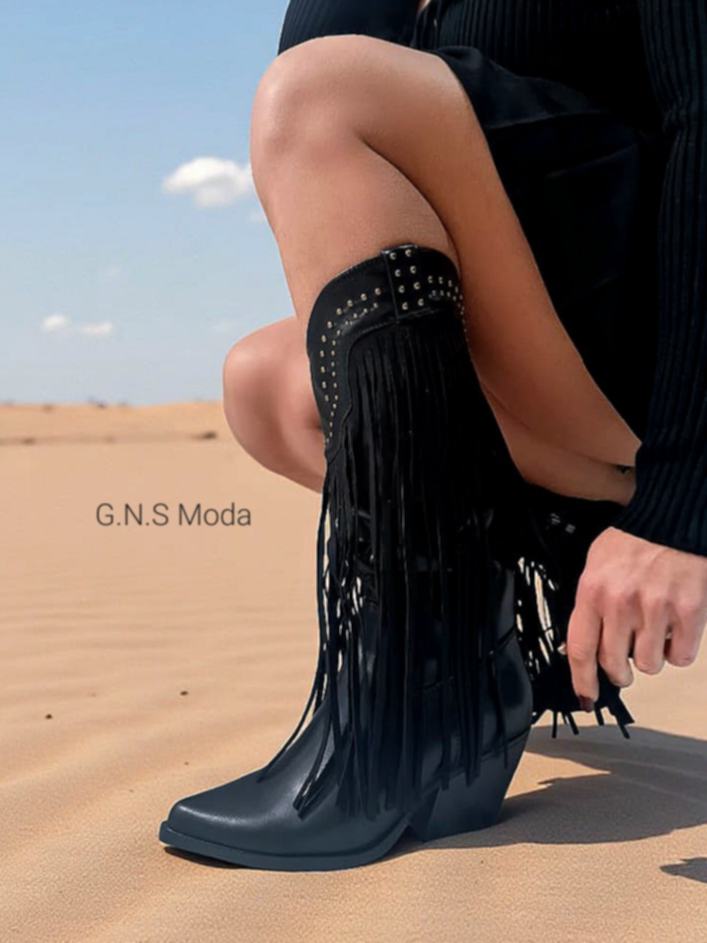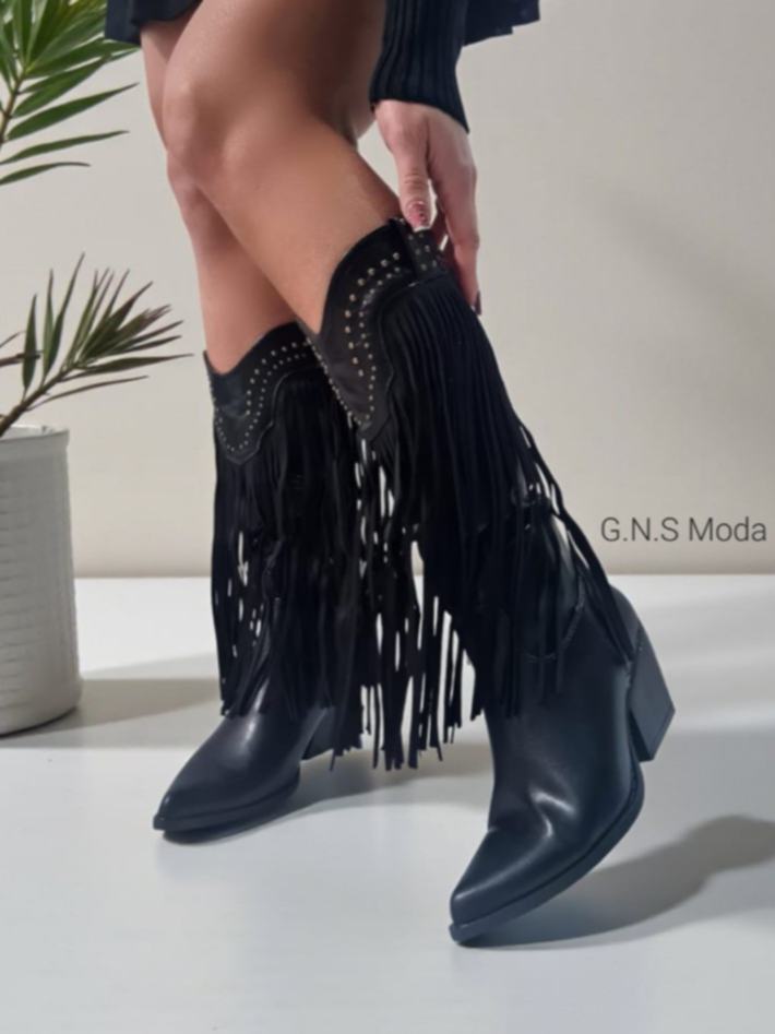 Stivali Camperos in pelle con borchie, frange e cerniera laterale.