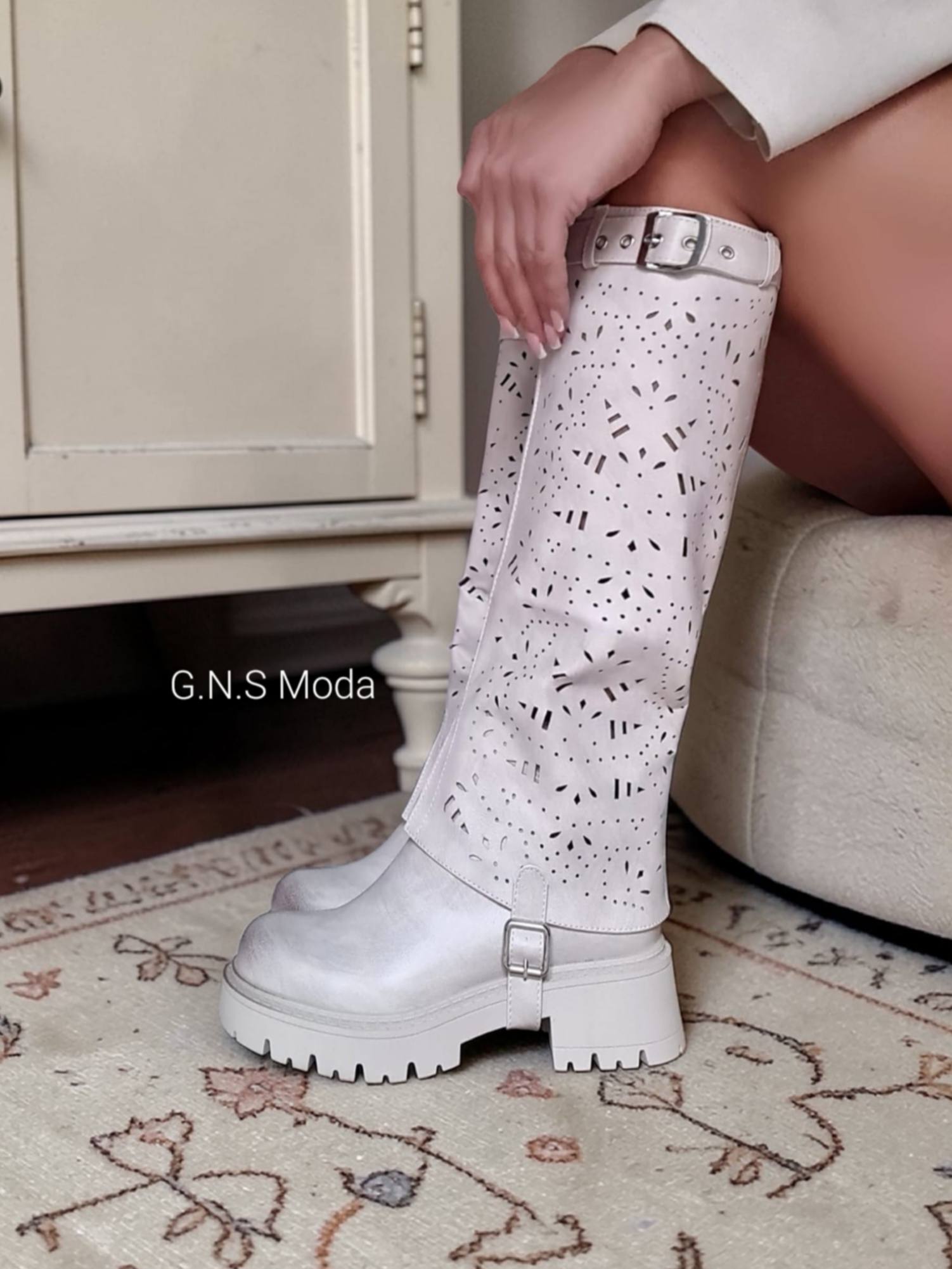 Stivali “2 in 1”, in pelle Traforata, con gambale rimovibile .